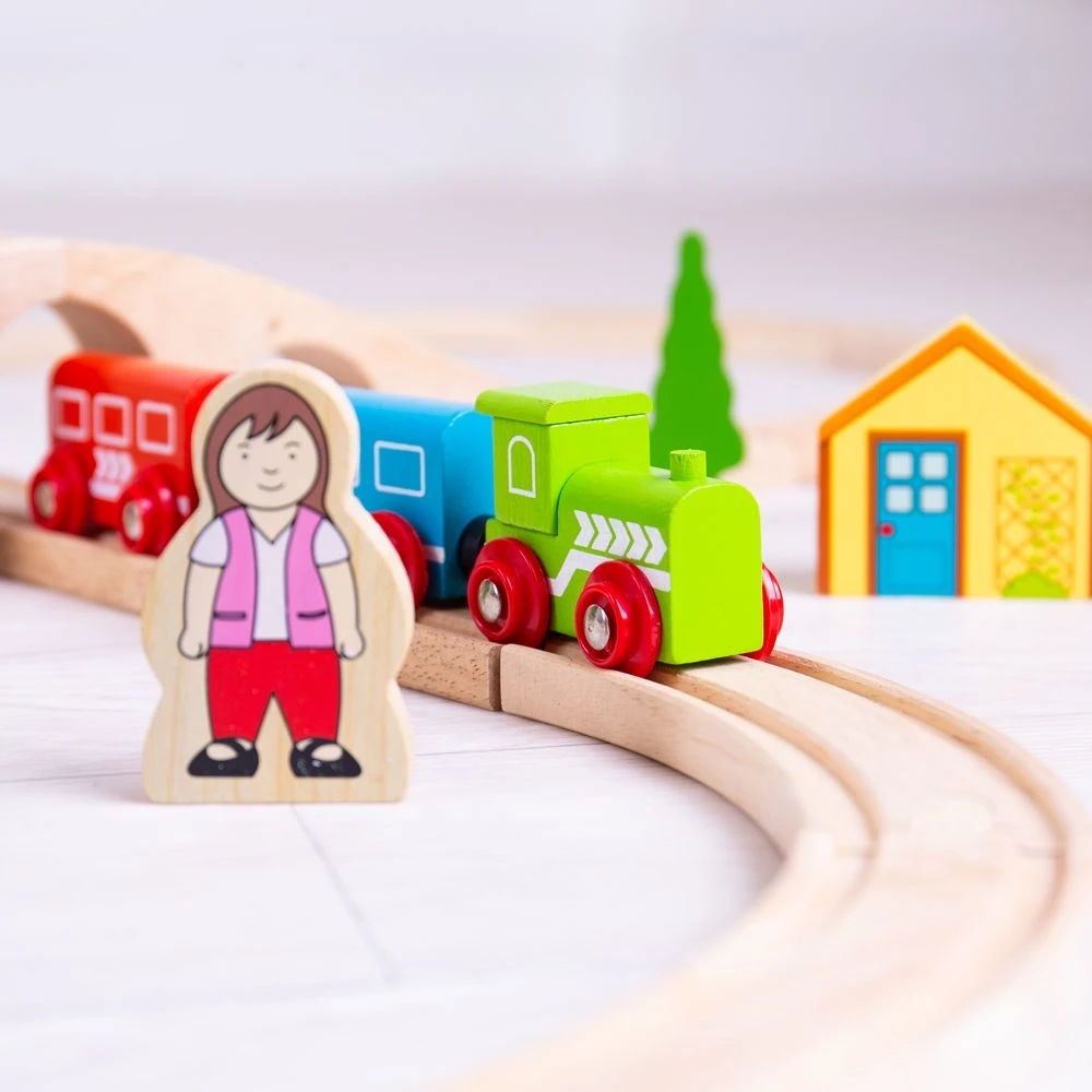 Deze complete treinset van Bigjigs is de ideale start om met de trein kennis te maken. De rails is in de vorm van een acht en bestaat uit een viaduct, trein met twee wagons en een aantal figuren.