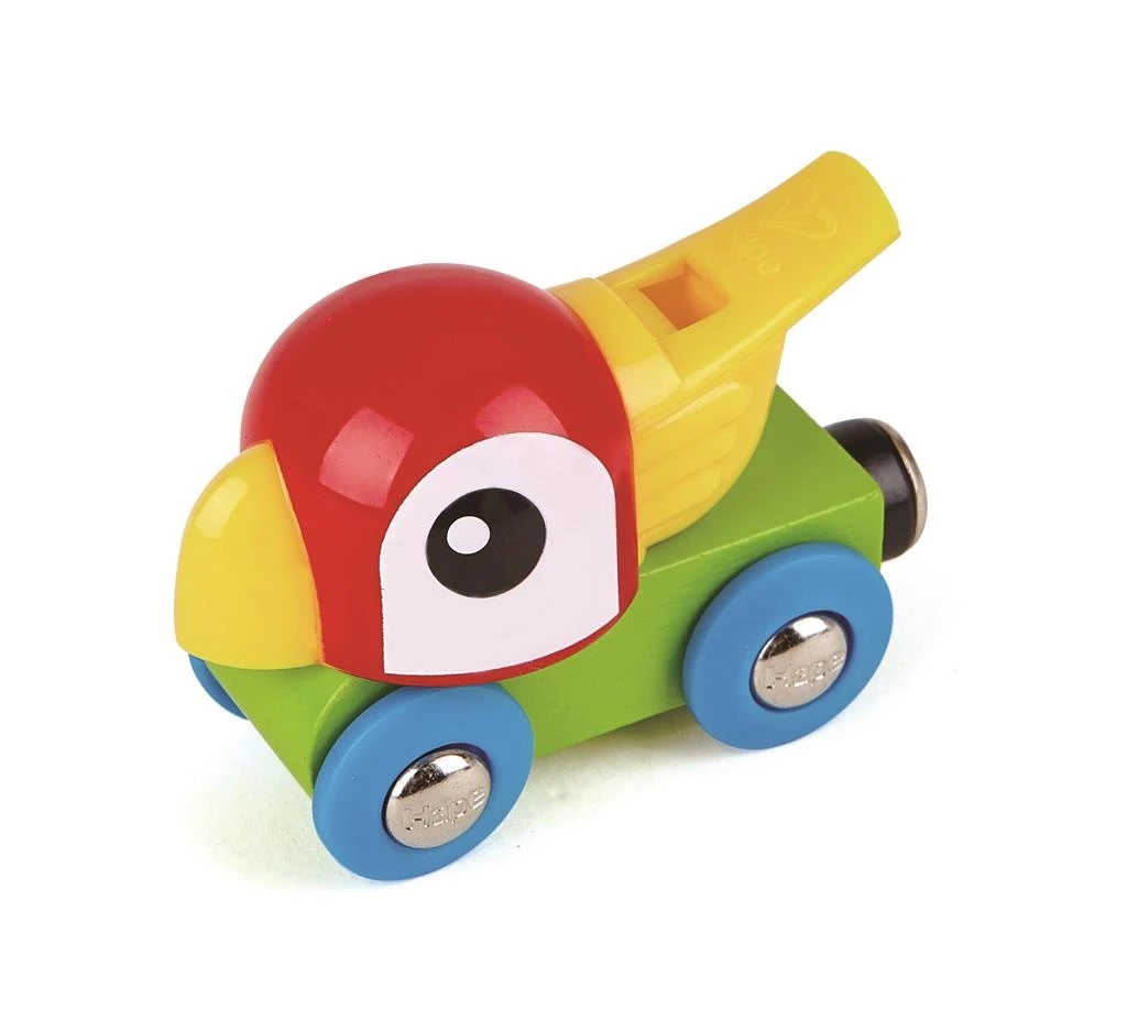 Opgepast! Hier komt de papegaaien locomotief van Hape aangereden. Dit is een fluit en trein tegelijk.