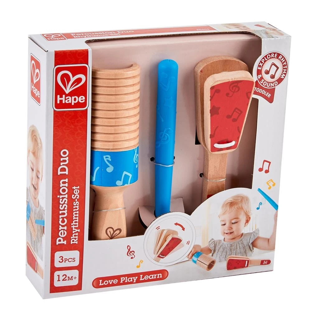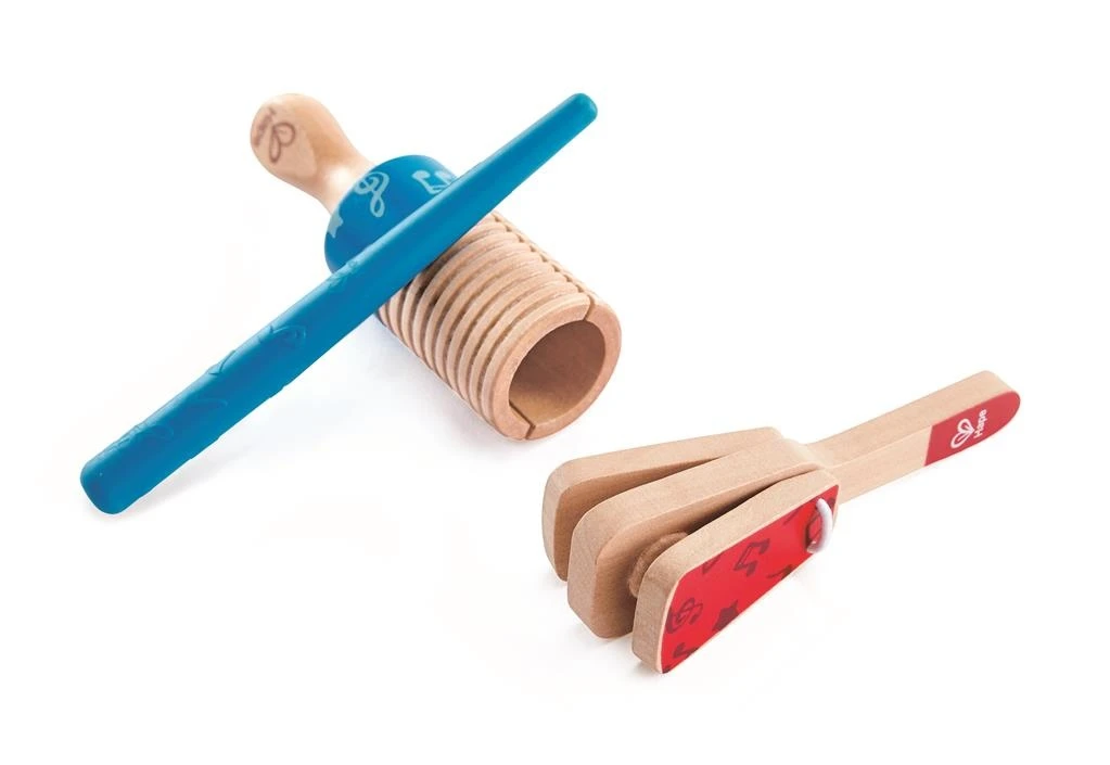 Maak met deze tweedelige percussie set van Hape een mooi stukje muziek. De set bestaat uit een klepperaar en een buistrom met een strijkstokje.