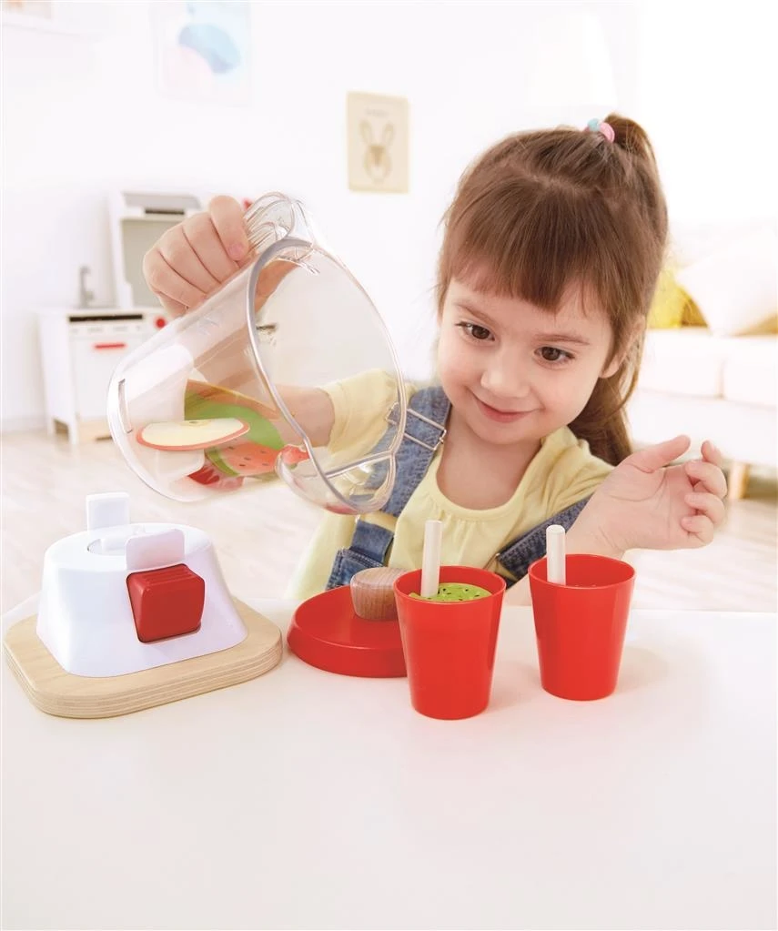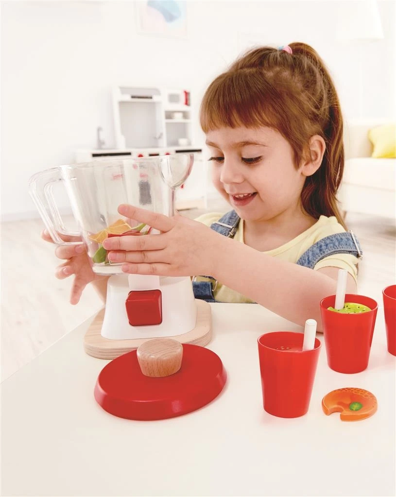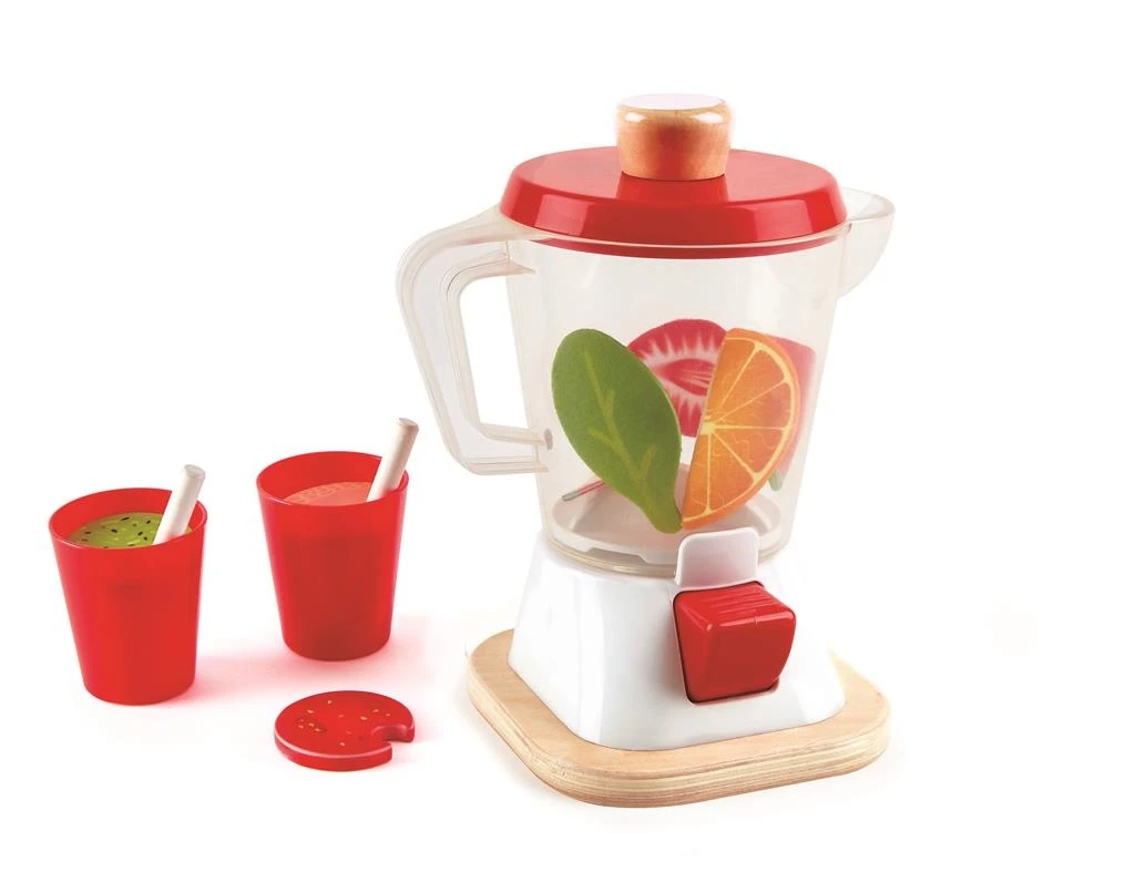 Jouw eigen gezonde smoothie maken dat kan met deze blender van Hape. De set bestaat uit twee bekers, verschillende soorten fruit en spinazieblaadjes.