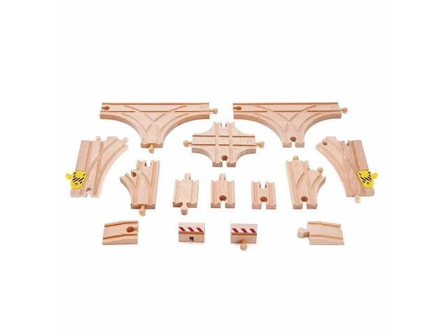 Met deze 14 delige set kun je jouw spoorbaan goed uitbreiden. De set bestaat uit houten spoorstukken, T-splitsingen en meer. De houten treinrails passen bij alle andere treinsets van Hape.