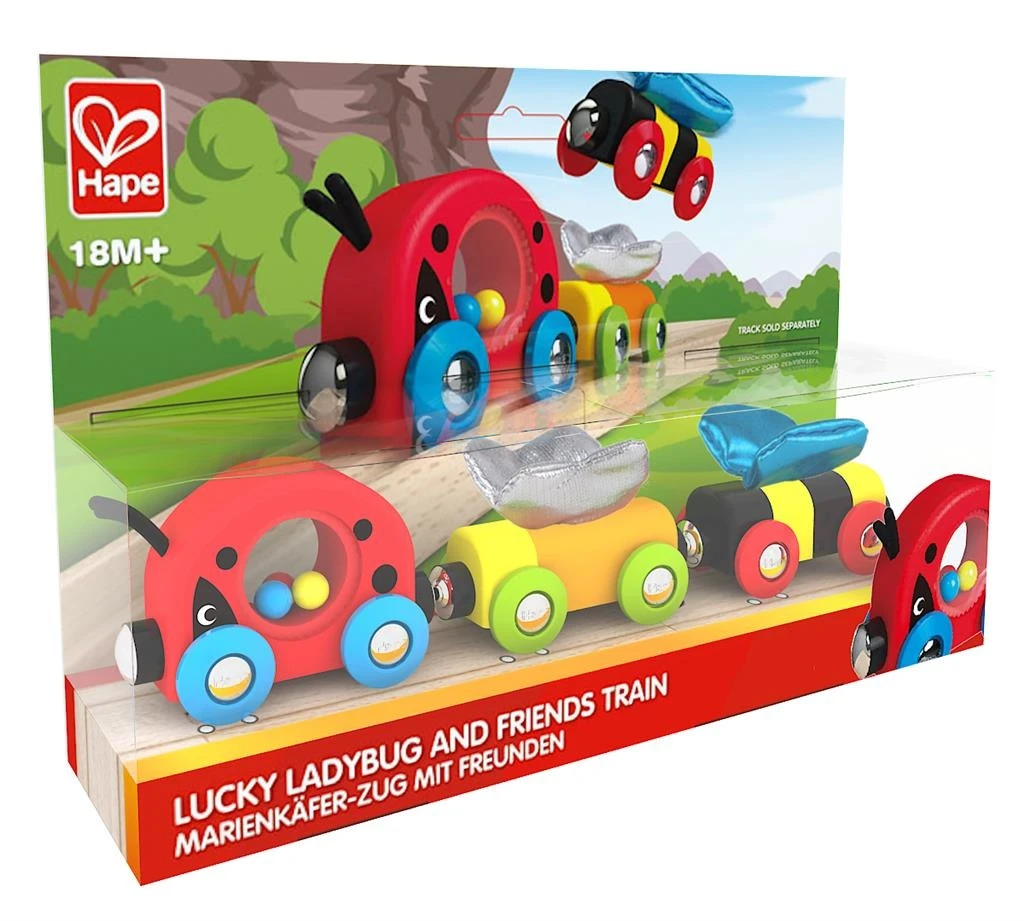 De lieveheersbeestje trein van Hape brengt dierenliefde op de rails. De wagons, een bij en een vlinder hebben knisperende vleugeltjes,