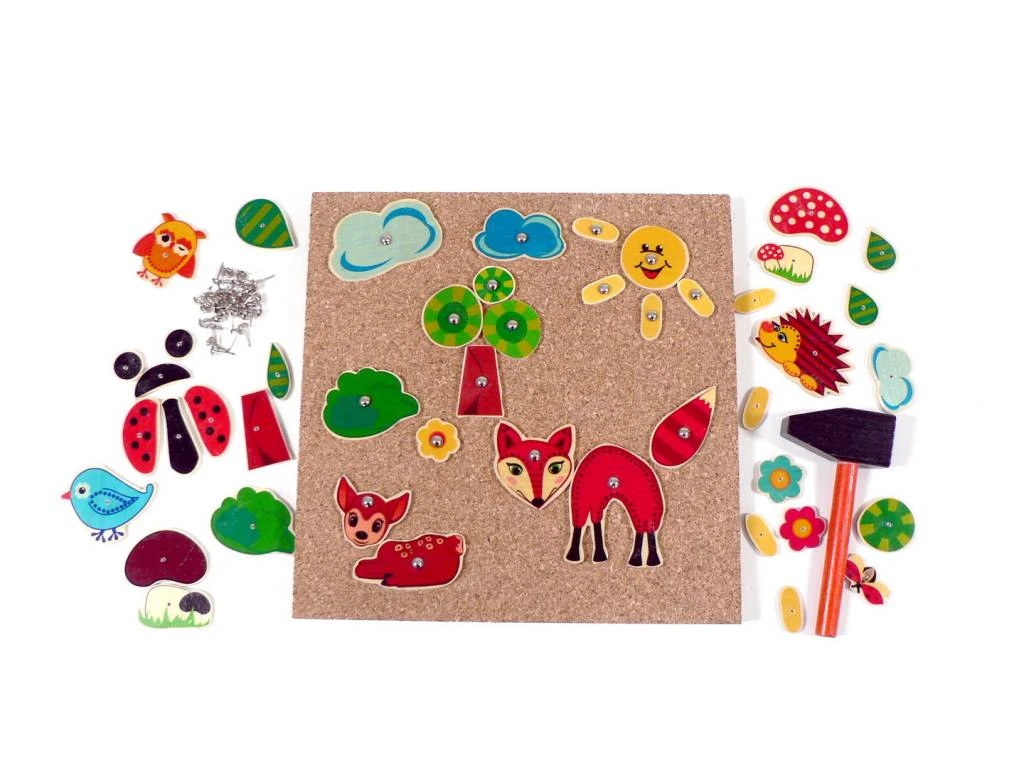 Dit is leuk je, eigen bostafereel in elkaar timmeren met dit hamertje tik spel. De set bestaat uit 50 gekleurde delen, een kurkplaat, een hamer en natuurlijk de spijkertjes.