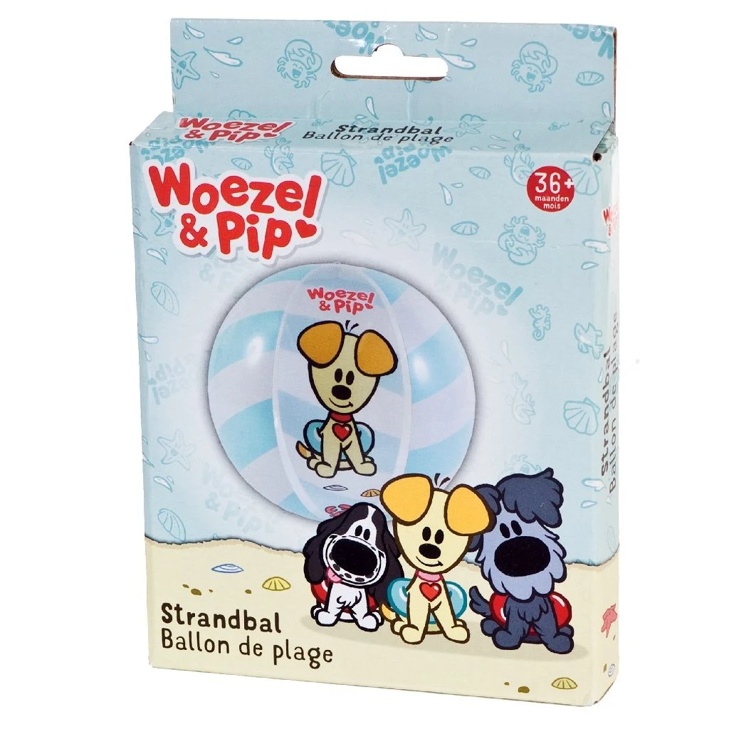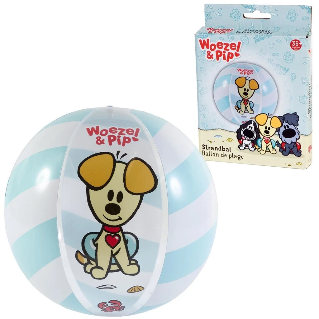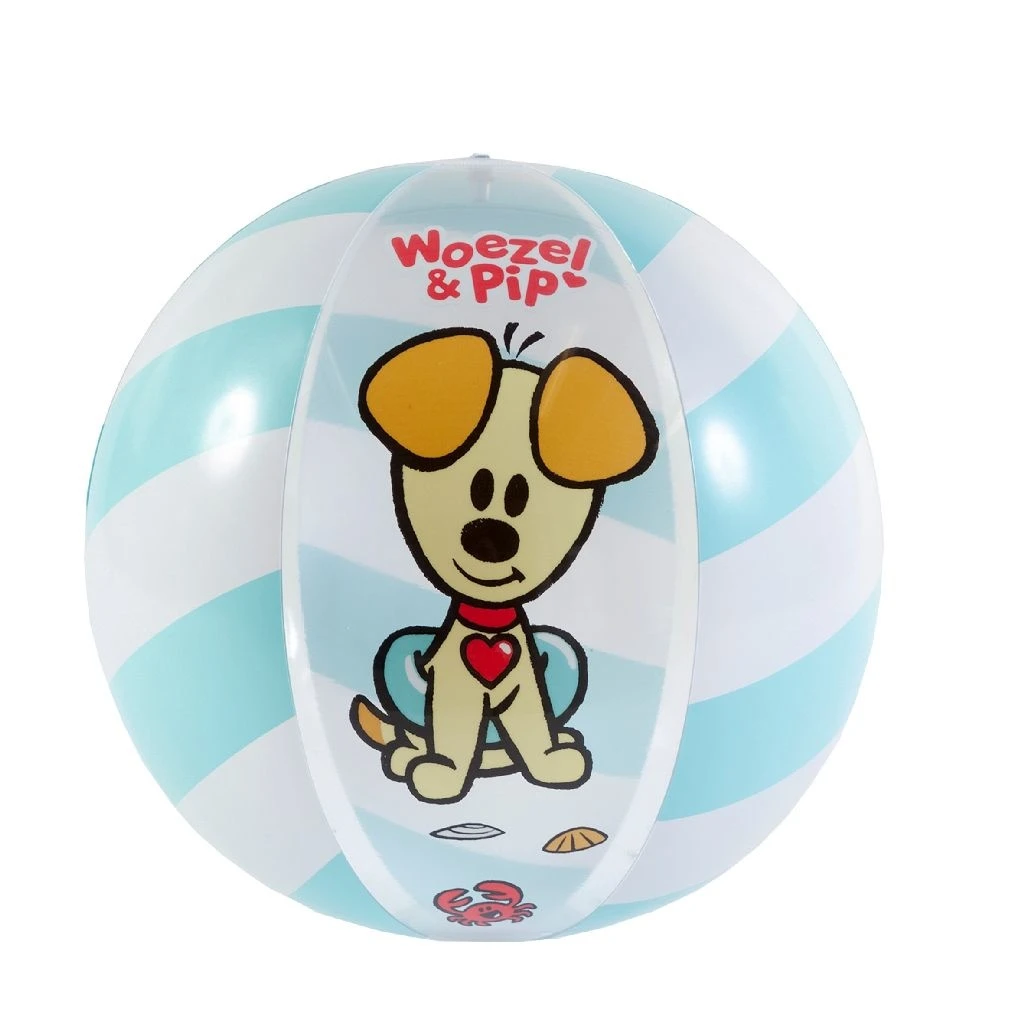 Woezel en Pip opblaas strandbal met een doorsnede van 50 cm. Aqua kleurig, met een vrolijk streep dessin en Woezel en Pip printjes. Tevens voorzien van de karakters Charlie en Buurpoes.